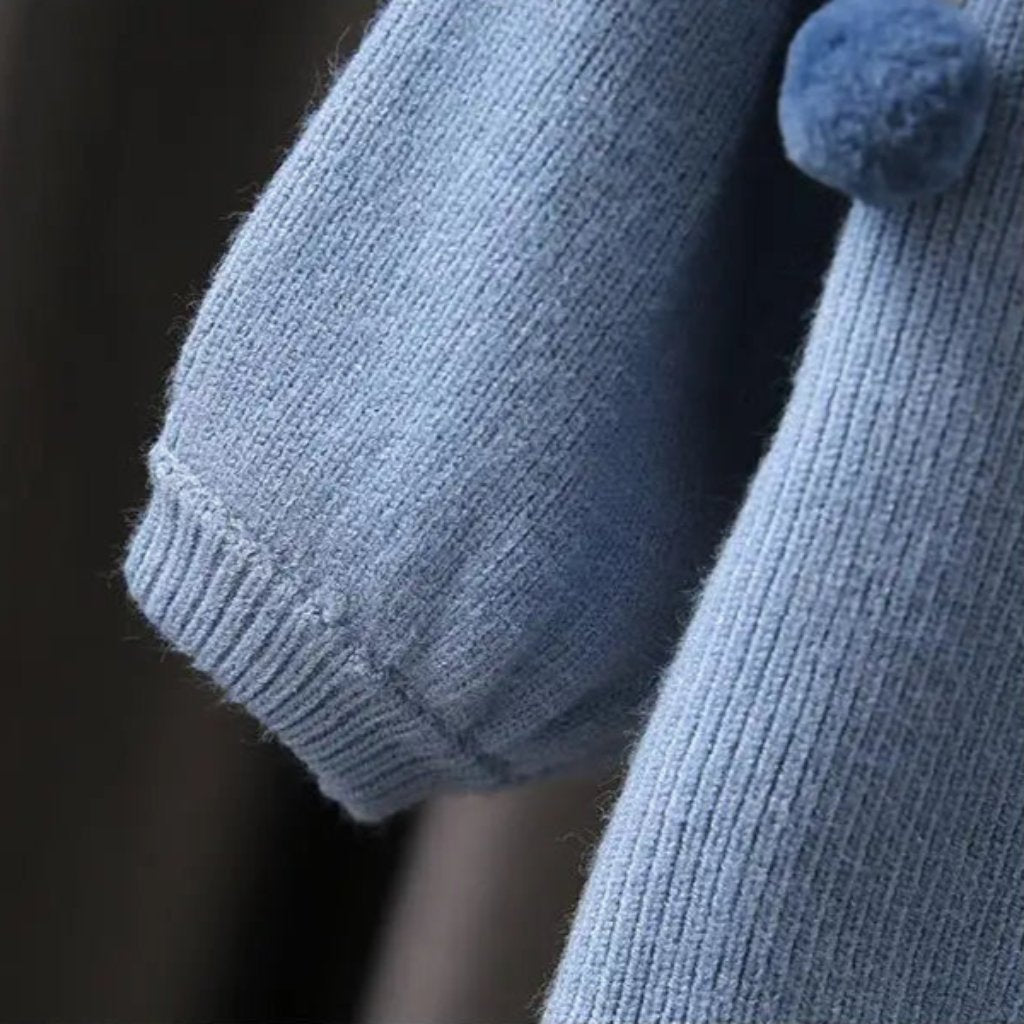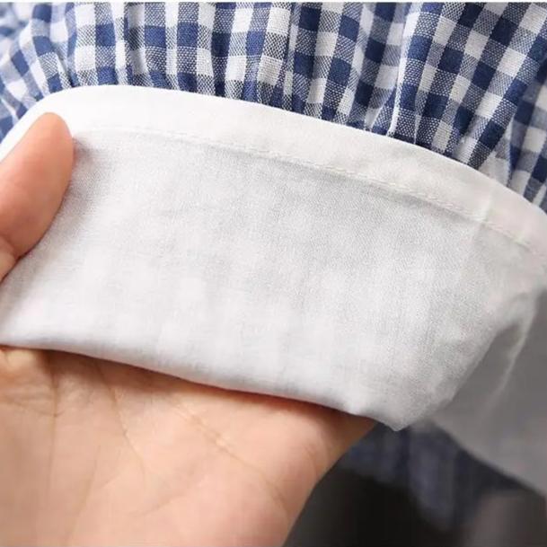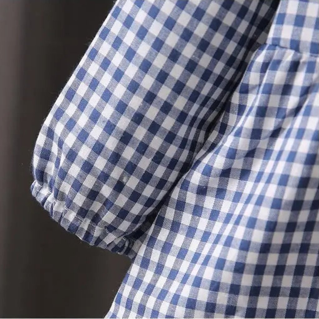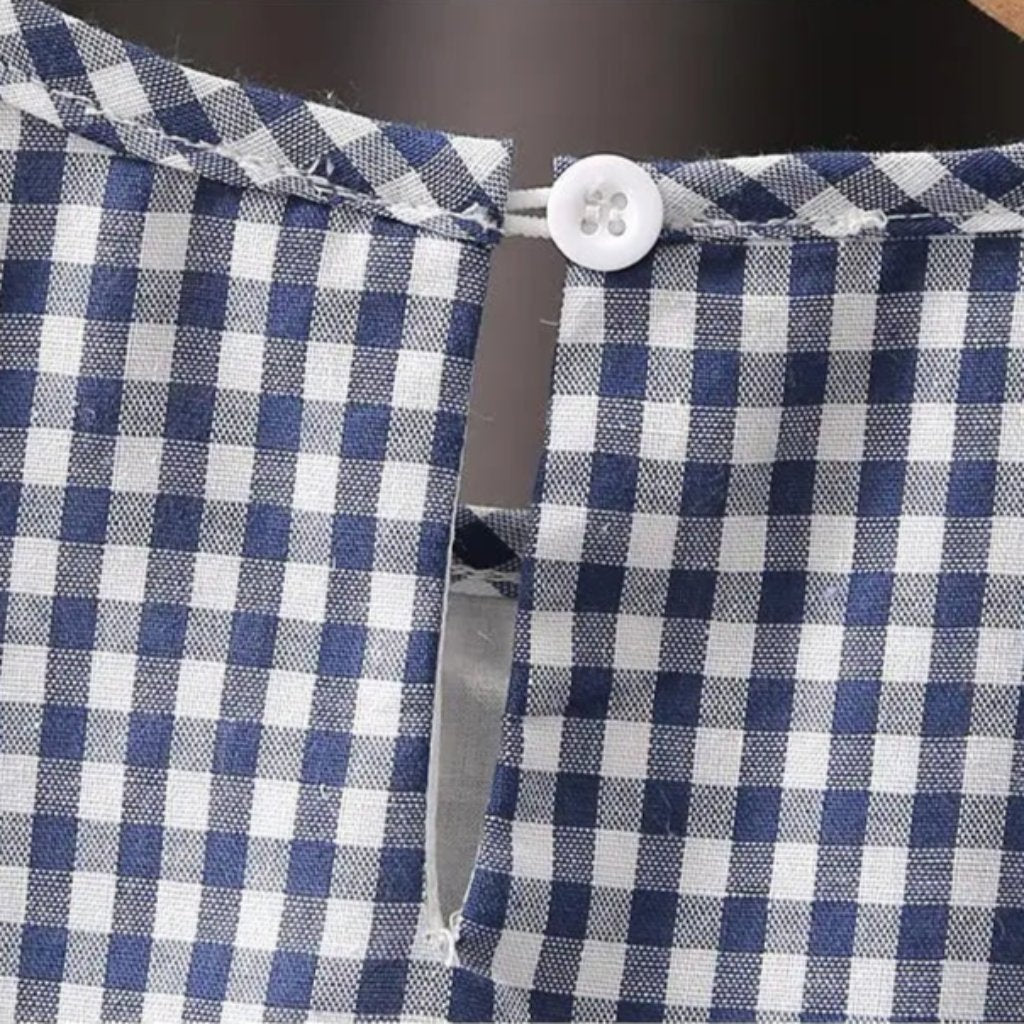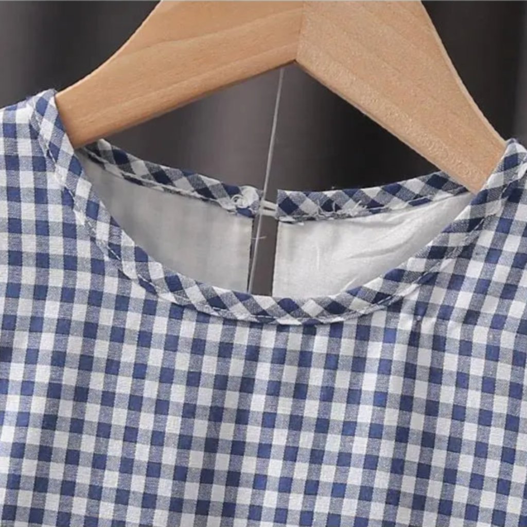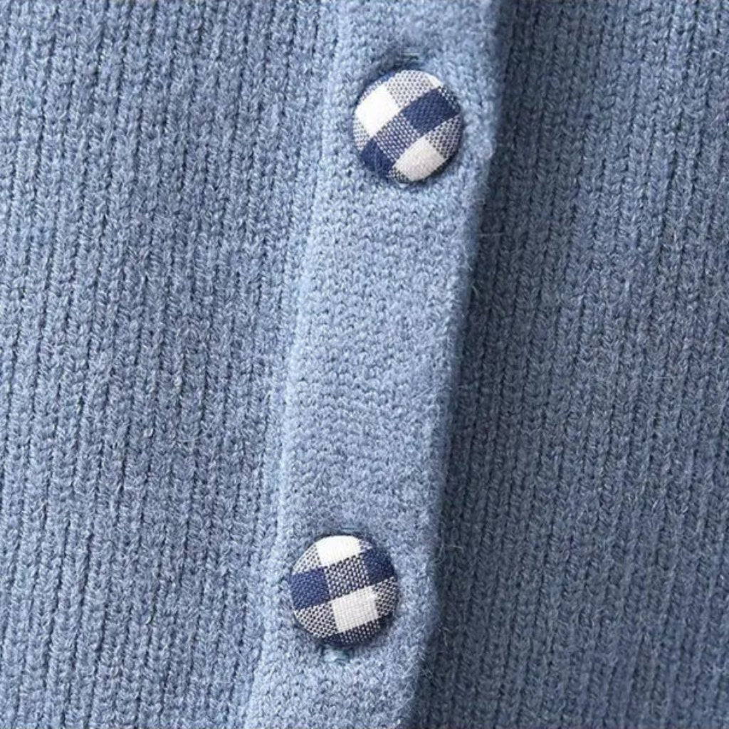 - The two-piece set includes a baby blue cardigan and a blue checkered dress.