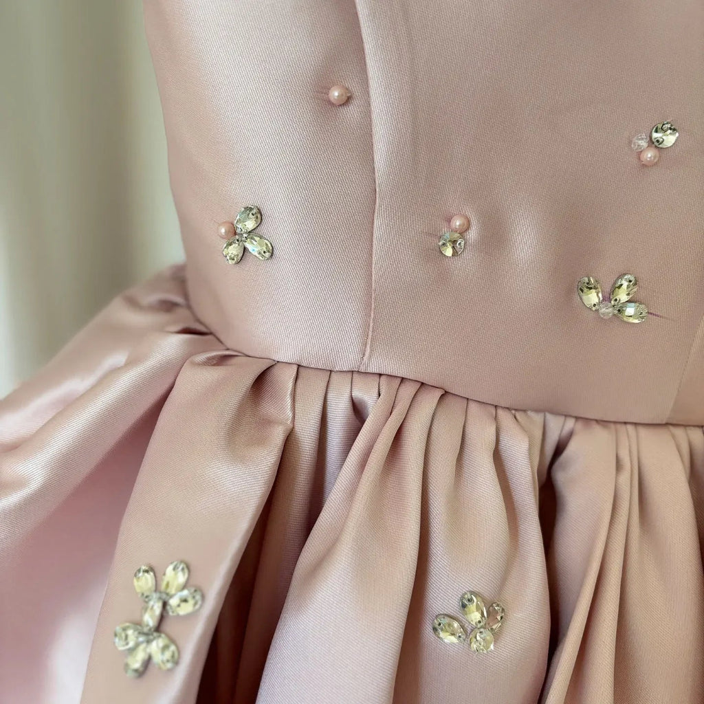 A timeless piece designed for life’s most special moments. The Onea Kids Flower Girl Dress is beautifully crafted in soft satin with a full pleated skirt that twirls with every step. Delicate floral embellishments add a touch of sparkle, making this dress as magical as the day itself.