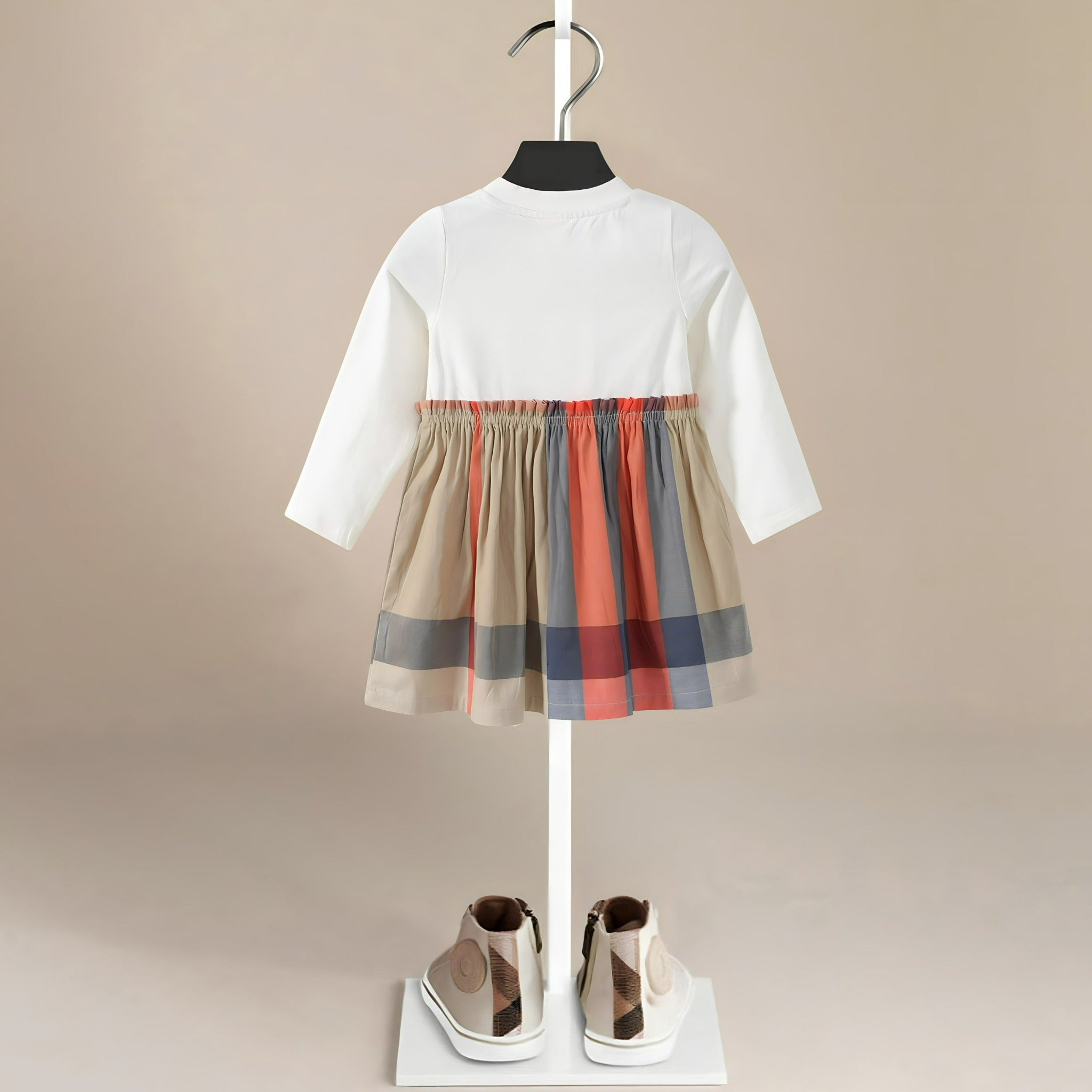The dress features a contrasting top in crisp white or chic black, paired with a beige plaid skirt for a refined yet playful look. Perfect for both special occasions and everyday moments, it blends traditional style with modern ease.