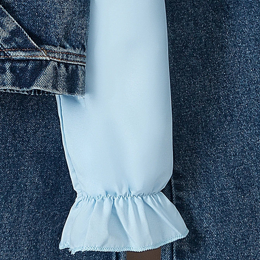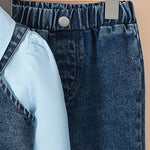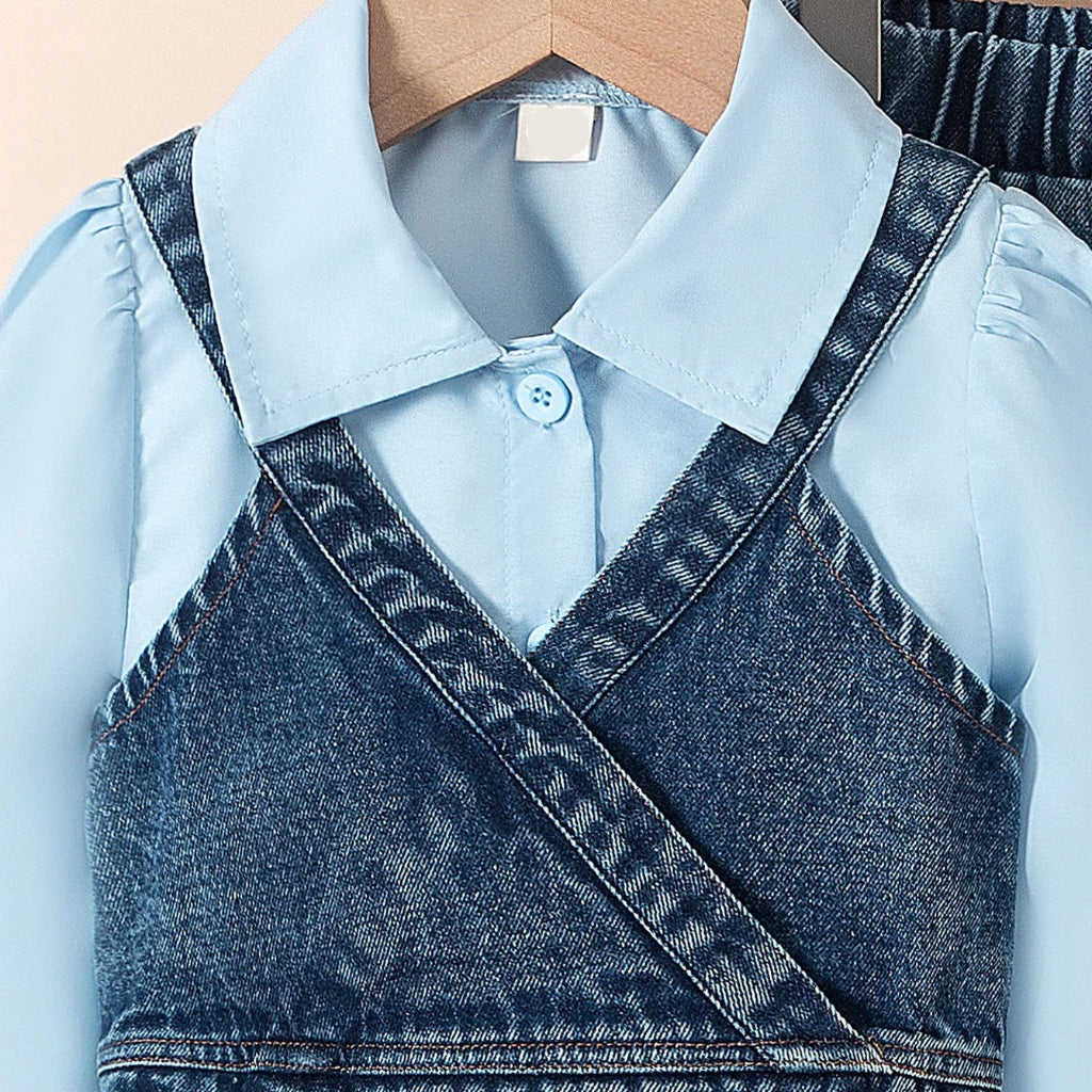 This two-piece denim outfit pairs a button-up shirt with stylish flared jeans featuring pearl embellishments - perfect for trendy young girls. The durable yet soft denim offers flexibility and comfort, making it ideal for all-day wear.
