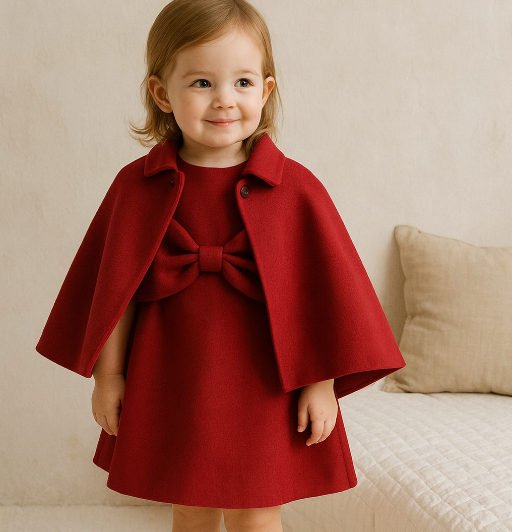 Red Two-Piece Holiday Set for Little Girls - Features a Dress with a Front Ribbon Bow and a Classic Poncho.