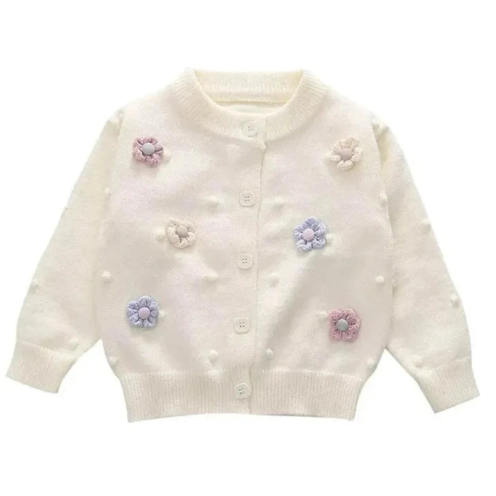 This charming knit cardigan is designed to wrap little ones in warmth while adding a sweet, delicate touch to their everyday outfits. The soft acrylic blend feels cozy and gentle against the skin, making it comfortable for extended wear during cooler days. Decorative floral accents create a playful, cheerful look that brings personality to simple outfits without sacrificing practicality. Its lightweight warmth makes it ideal for layering over tops or dresses, allowing children to stay comfortable as temperatures change. The button-front design makes dressing quick and easy for busy mornings. A relaxed fit supports natural movement, encouraging active play without restriction. Durable construction ensures it maintains shape and softness through repeated washing. Altogether, this cardigan blends comfort, style, and everyday function for seasonal wear.