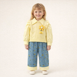 A cheerful cotton set designed with bright floral accents, offering both comfort and charm. The top features a warm yellow tone with a cute flower detail, paired with soft patterned pants that create a playful yet coordinated look. This outfit provides warmth without heaviness, making it perfect for daily wear in cooler seasons.