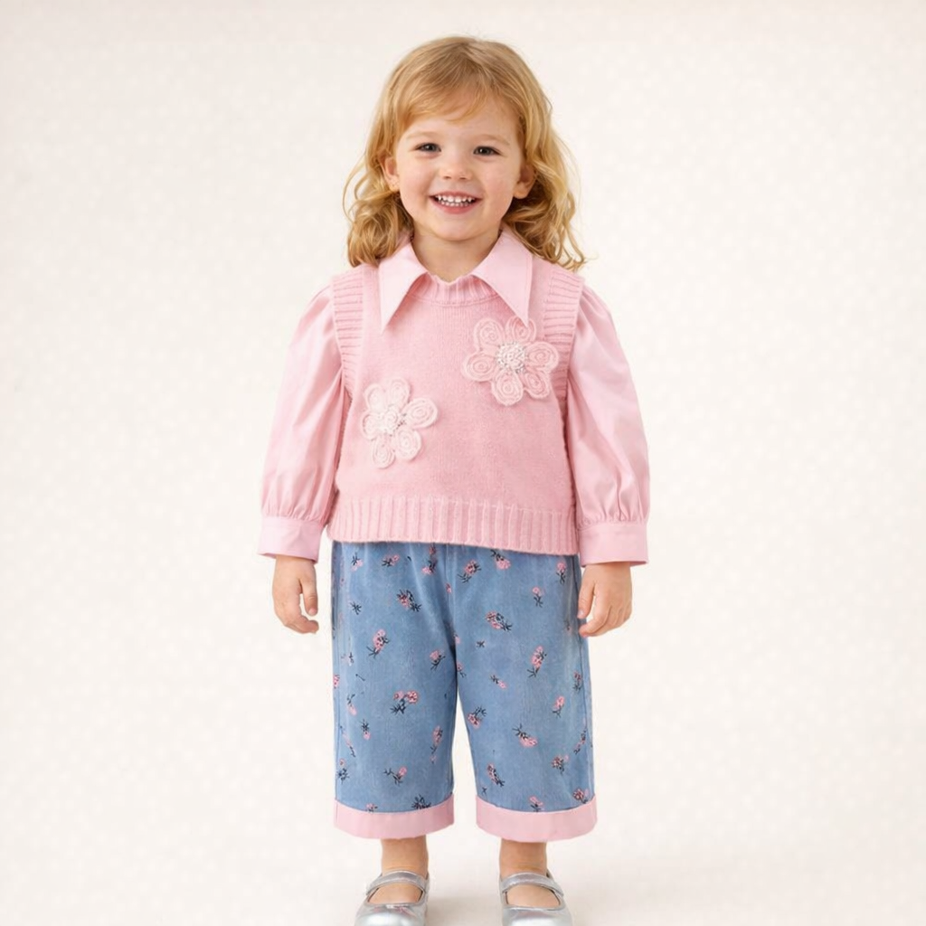 A soft and stylish winter set that blends warmth with adorable pastel charm. This outfit includes a cozy knit sweater decorated with gentle flower appliqués and matching loose-fit pants with a playful print. The breathable cotton blend ensures comfort all day long, giving little ones a warm but lightweight feel suitable for winter layering.