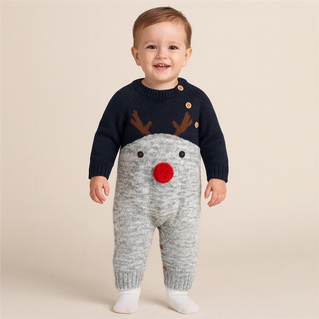 A cozy and adorable holiday essential, this reindeer-themed romper wraps your little one in warmth and seasonal cheer. Featuring a cute reindeer face design with a festive red nose, this soft knit outfit combines comfort and charm. Perfect for babies who need extra warmth during the winter months while still looking picture-ready for holiday photos.