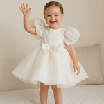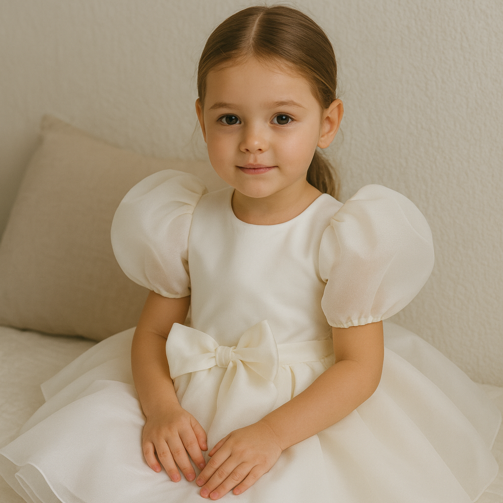 Este exquisito vestido, confeccionado con lujosos materiales como satén y tul, cae con gracia por debajo de la rodilla, combinando la elegancia clásica con un toque moderno. Su paleta de colores blanco y rosa pálido evoca un encanto suave y etéreo, lo que lo convierte en la opción ideal para el cumpleaños de tu pequeña, como vestido de niña de las flores, para ceremonias de bautizo o cualquier ocasión especial.