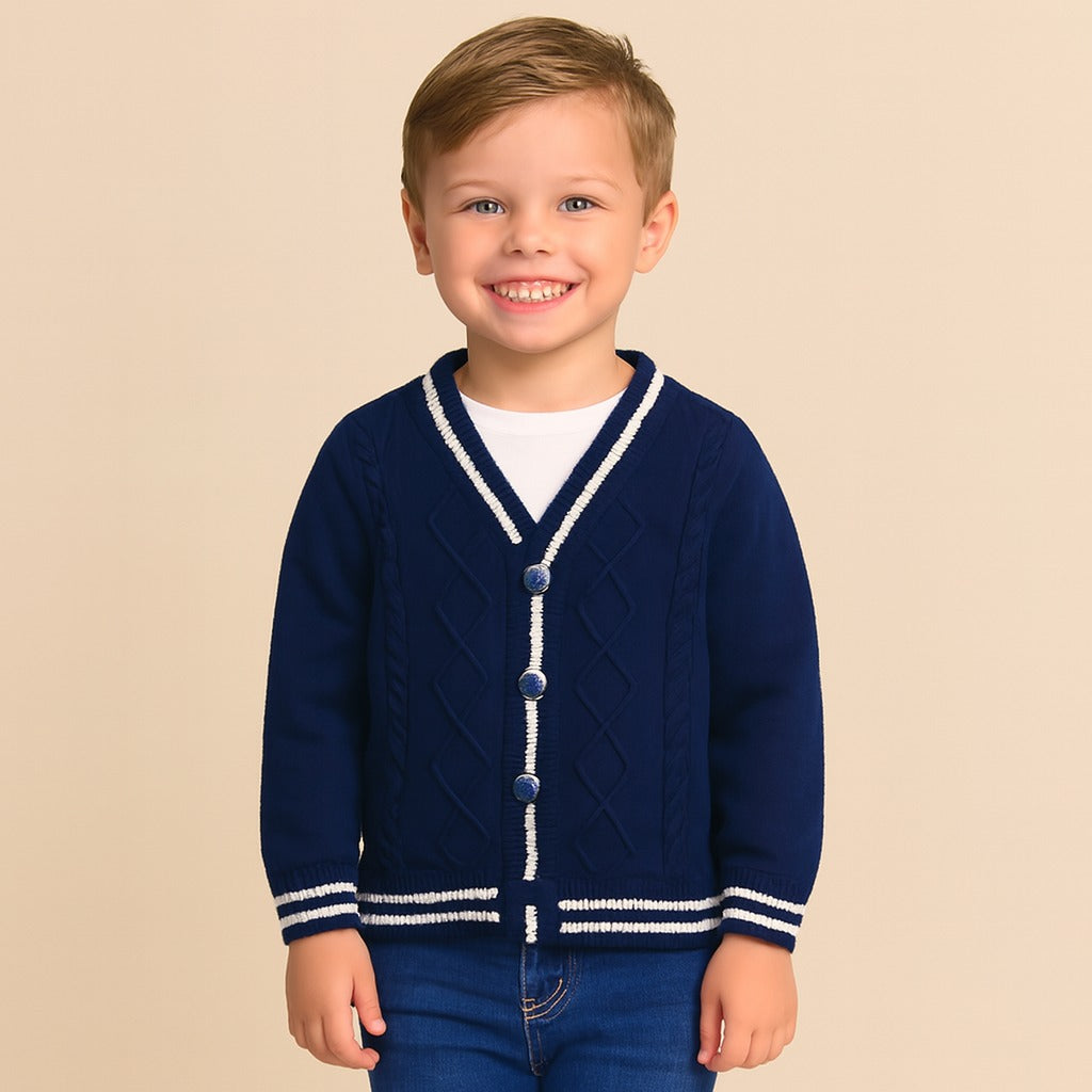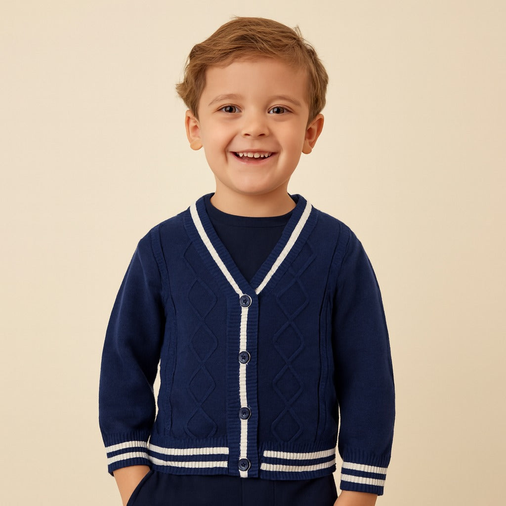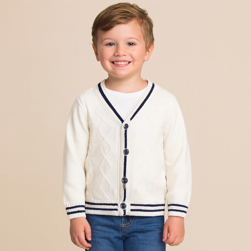 Características: Este encantador cárdigan presenta un clásico cierre de botones y mangas largas. El cuello y los puños de punto acanalado le dan un toque de estilo atemporal, convirtiéndolo en una adorable adición al guardarropa de tu pequeño.