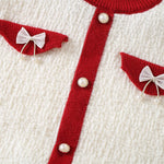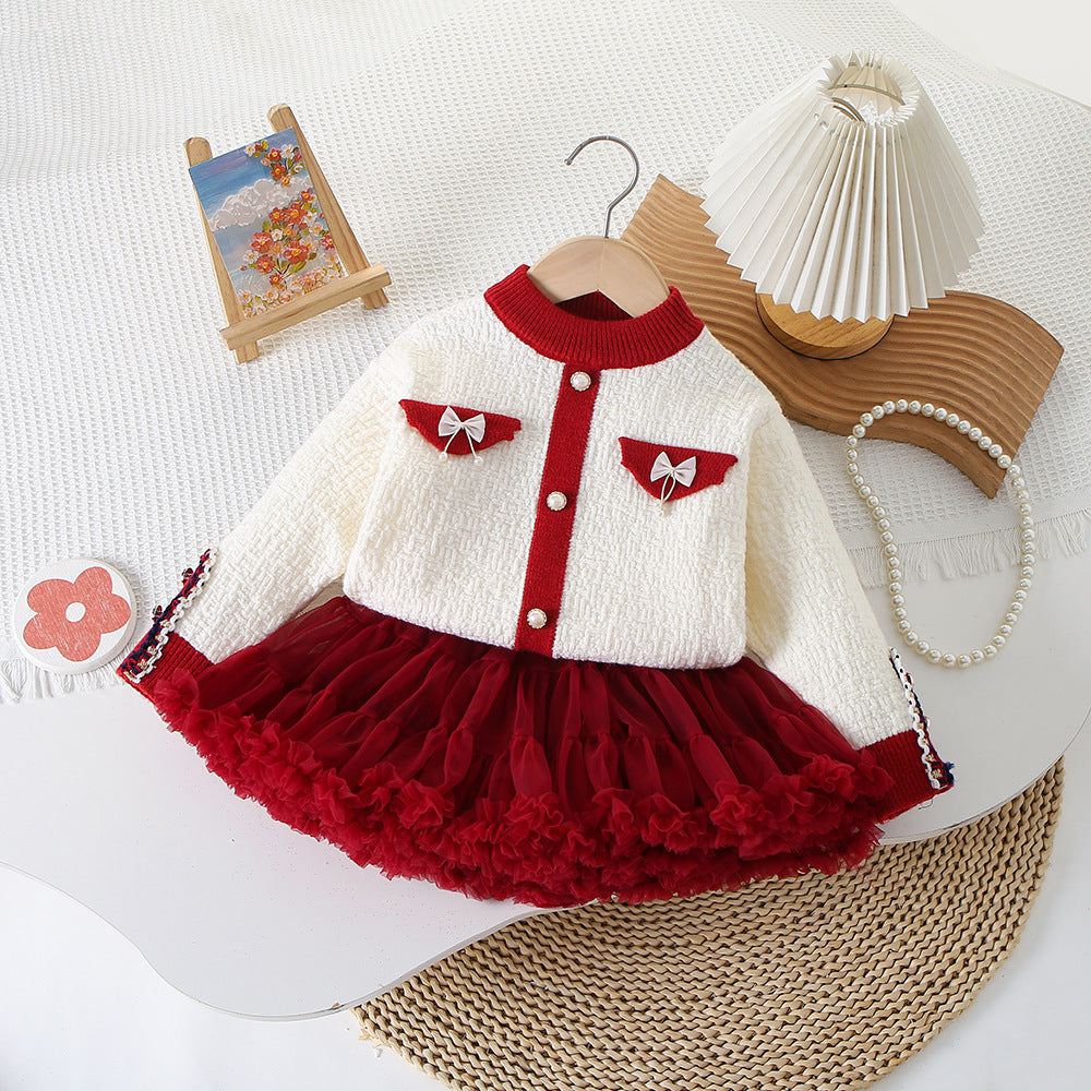 A festive winter set featuring a soft acrylic heart-embroidered cardigan paired with a layered red tutu skirt. The knit top offers cozy warmth with adorable heart patches and a delicate collar design, while the fluffy tulle skirt creates the perfect girl-princess silhouette. Ideal for Christmas events, Valentine’s shoots, birthdays, and family gatherings — this outfit blends comfort with festive elegance.