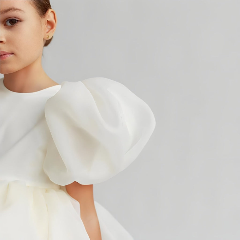 Este exquisito vestido, confeccionado con lujosos materiales como satén y tul, cae con gracia por debajo de la rodilla, combinando la elegancia clásica con un toque moderno. Su paleta de colores blanco y rosa pálido evoca un encanto suave y etéreo, lo que lo convierte en la opción ideal para el cumpleaños de tu pequeña, como vestido de niña de las flores, para ceremonias de bautizo o cualquier ocasión especial.