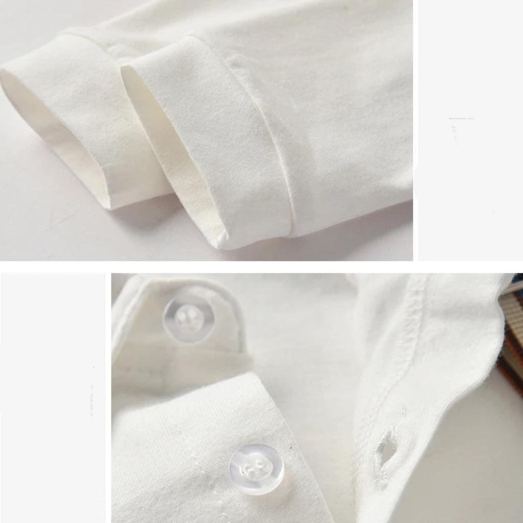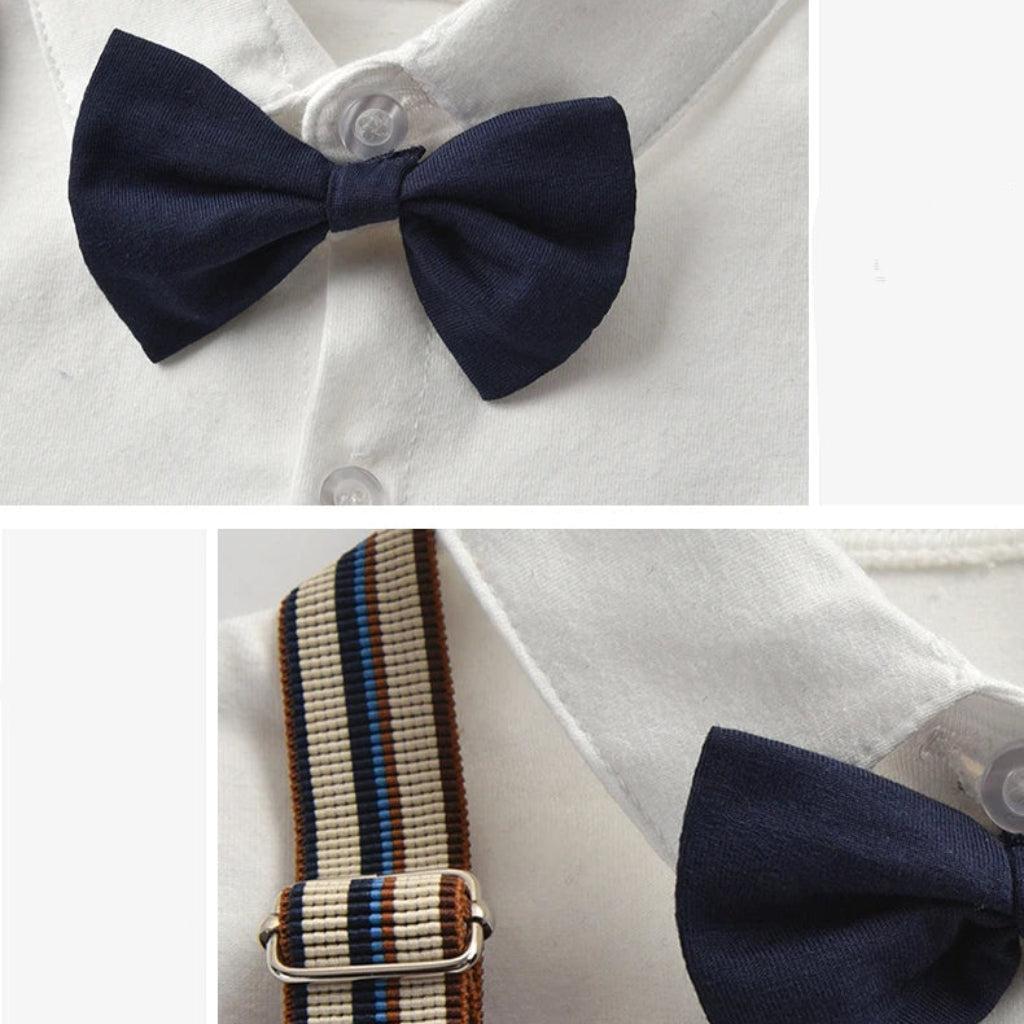 El conjunto incluye: Camisa blanca con botones, short azul marino, pajarita y tirantes para un look informal y formal. Conjunto de niño para la vuelta al cole.