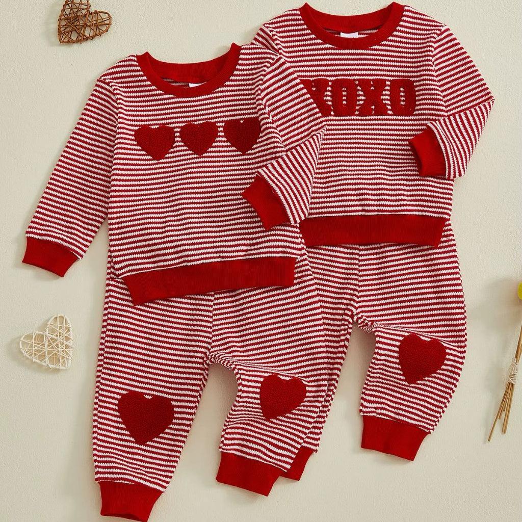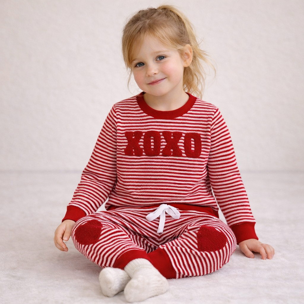 This cozy two-piece set brings warmth, softness, and adorable seasonal charm together in one outfit. Crafted from gentle cotton knit, it keeps little ones comfortable while providing light insulation for cooler days. The heart-patterned design adds a sweet and playful touch, making it perfect for festive moments or everyday wear. A relaxed fit ensures ease of movement, whether kids are playing at home or heading out with family. The matching top and bottom create a coordinated look that requires minimal styling effort. Soft ribbed cuffs help keep warmth in while maintaining a comfortable fit. Both practical and charming, this set is a favorite for parents who value comfort with a hint of cuteness.