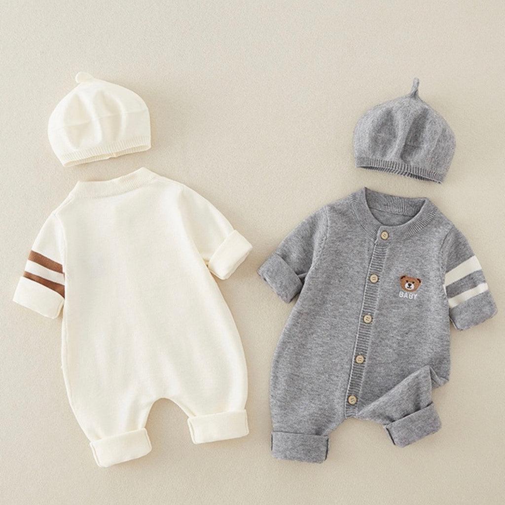 This adorable baby romper set comes complete with a matching hat, creating a coordinated and winter-ready look for little ones. Crafted from soft fabric, it offers warmth without adding bulk, allowing babies to stay comfortable while remaining fully covered during chilly days.