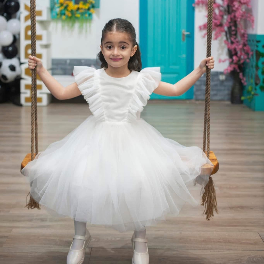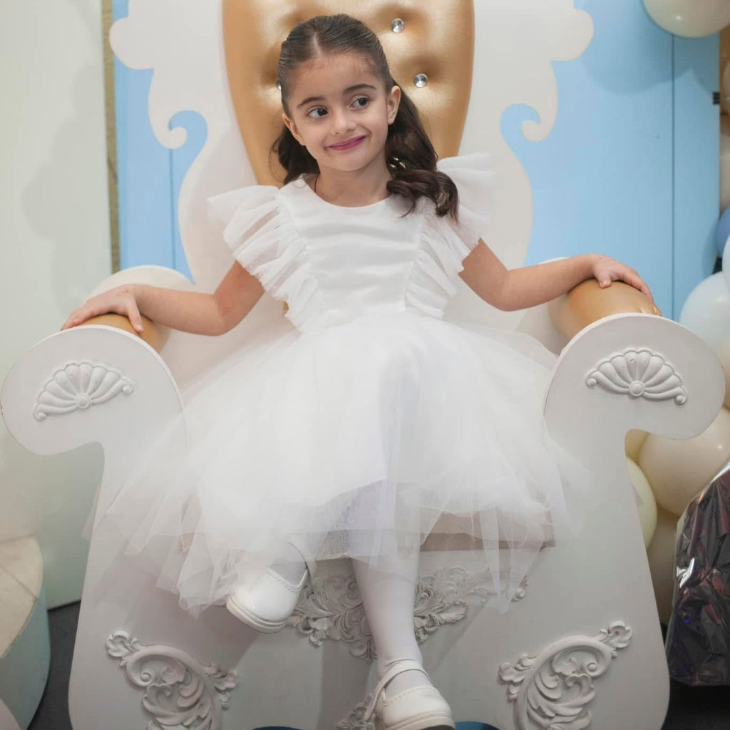 Cette robe exquise, confectionnée en tulle luxueux, tombe gracieusement sous le genou, alliant élégance classique et modernité. Sa palette de couleurs, composée de blanc et de gris intense, lui confère un charme doux et aérien, idéal pour l'anniversaire de votre fille, comme tenue de demoiselle d'honneur, pour un baptême ou toute autre occasion importante.