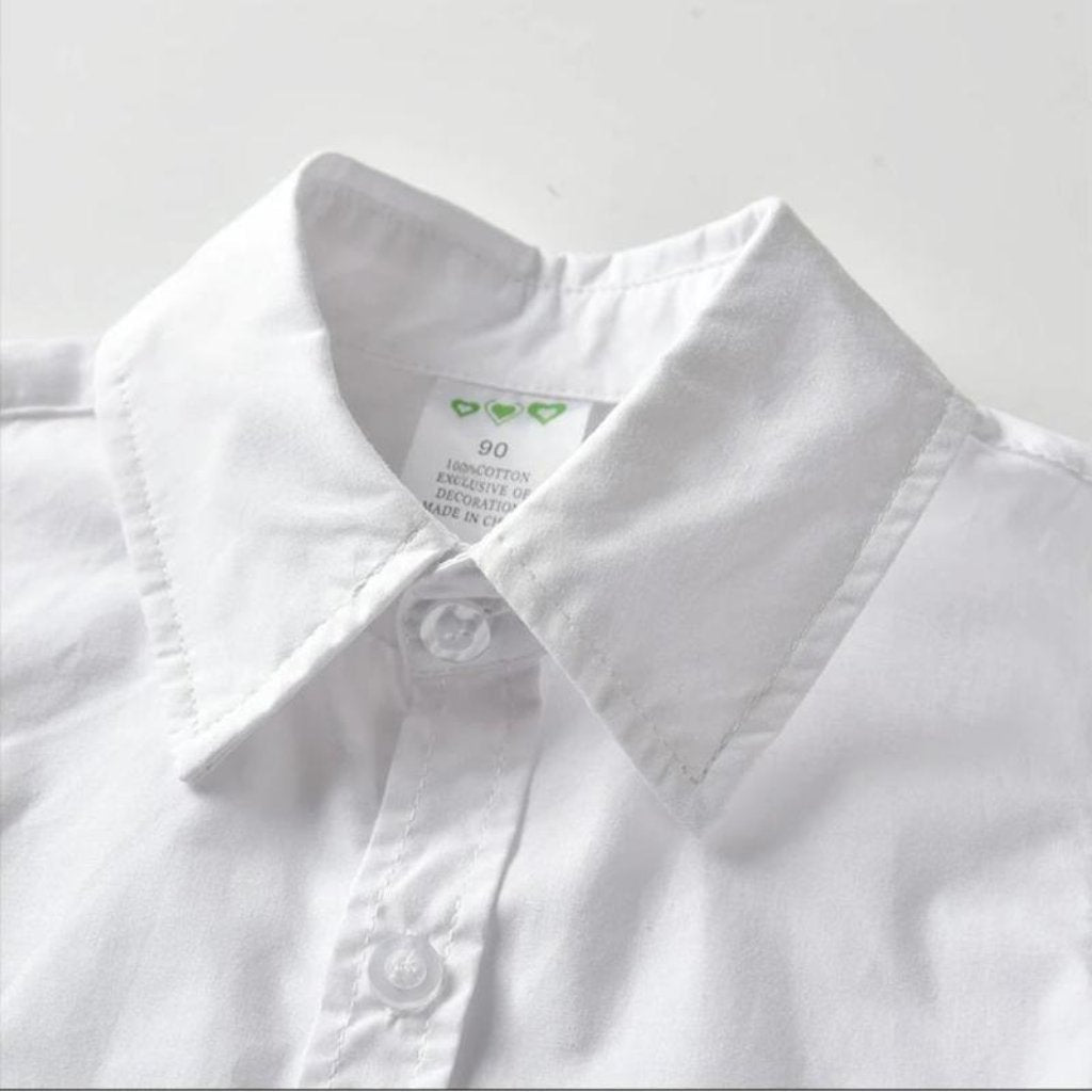 L'ensemble comprend : une chemise boutonnée blanche, un short bleu marine, un nœud papillon et des bretelles à trois points pour une tenue décontractée et habillée. Tenue de rentrée pour garçon.