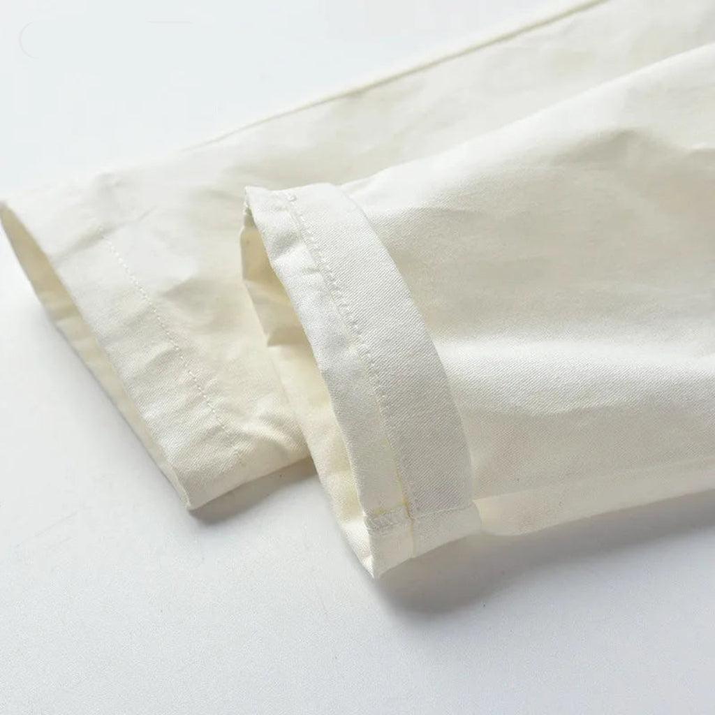 L'ensemble comprend : une chemise boutonnée blanche, un short bleu marine, un nœud papillon et des bretelles à trois points pour une tenue décontractée et habillée. Tenue de rentrée pour garçon.