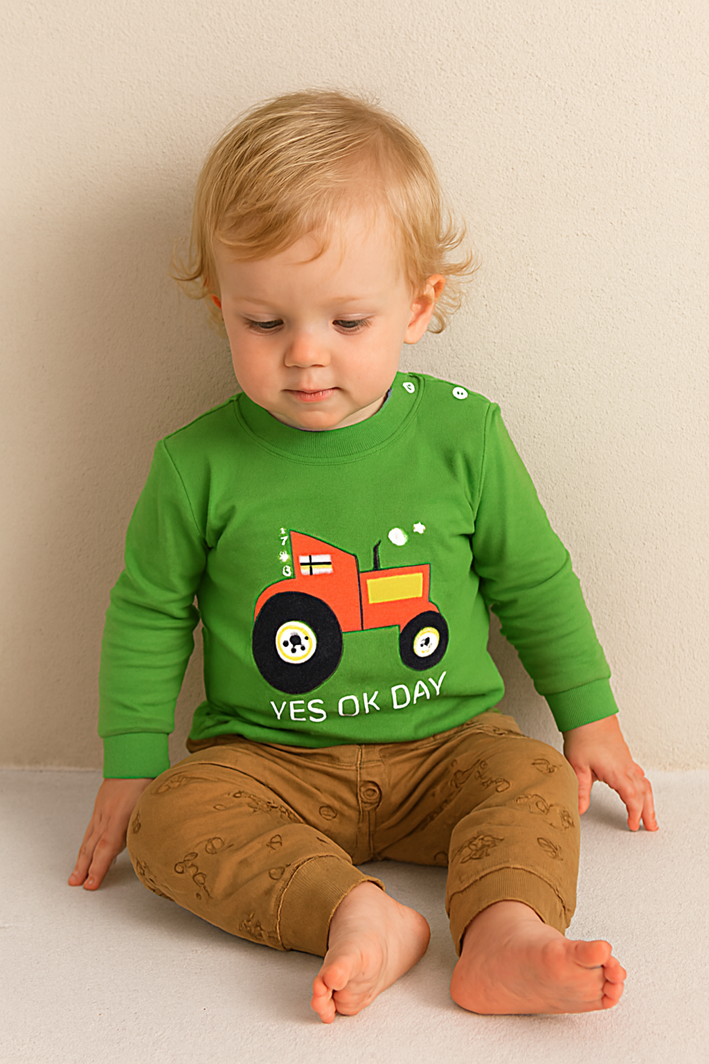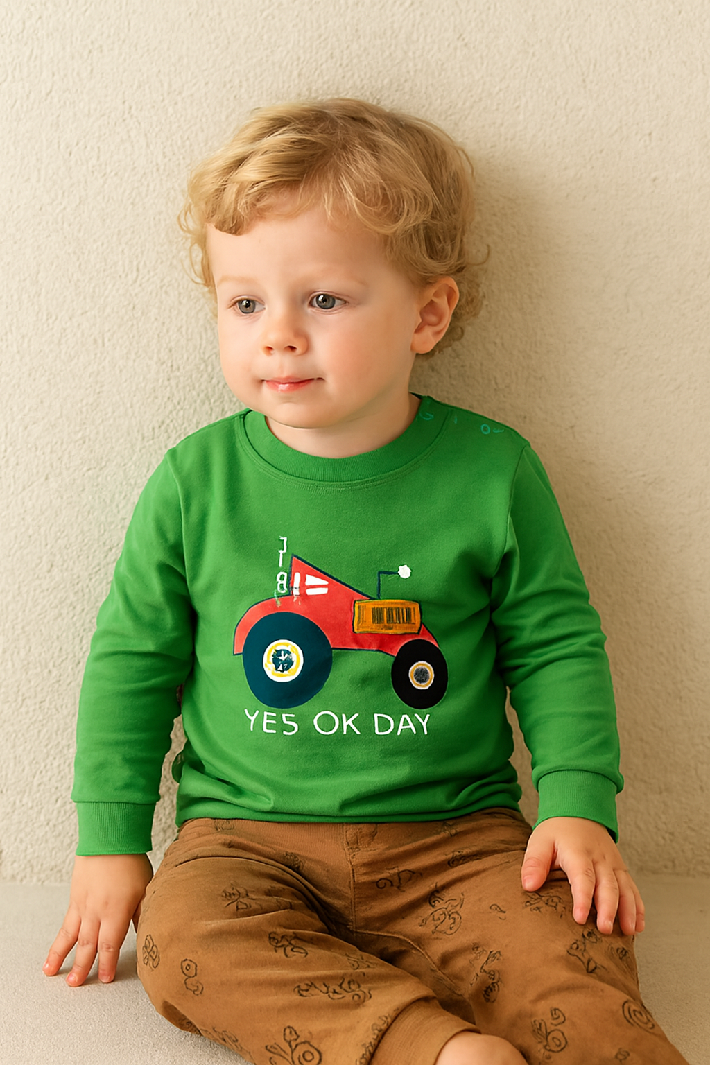 Unleash adventure with this charming set featuring a green top and beige pants, designed for comfort and playful style.