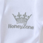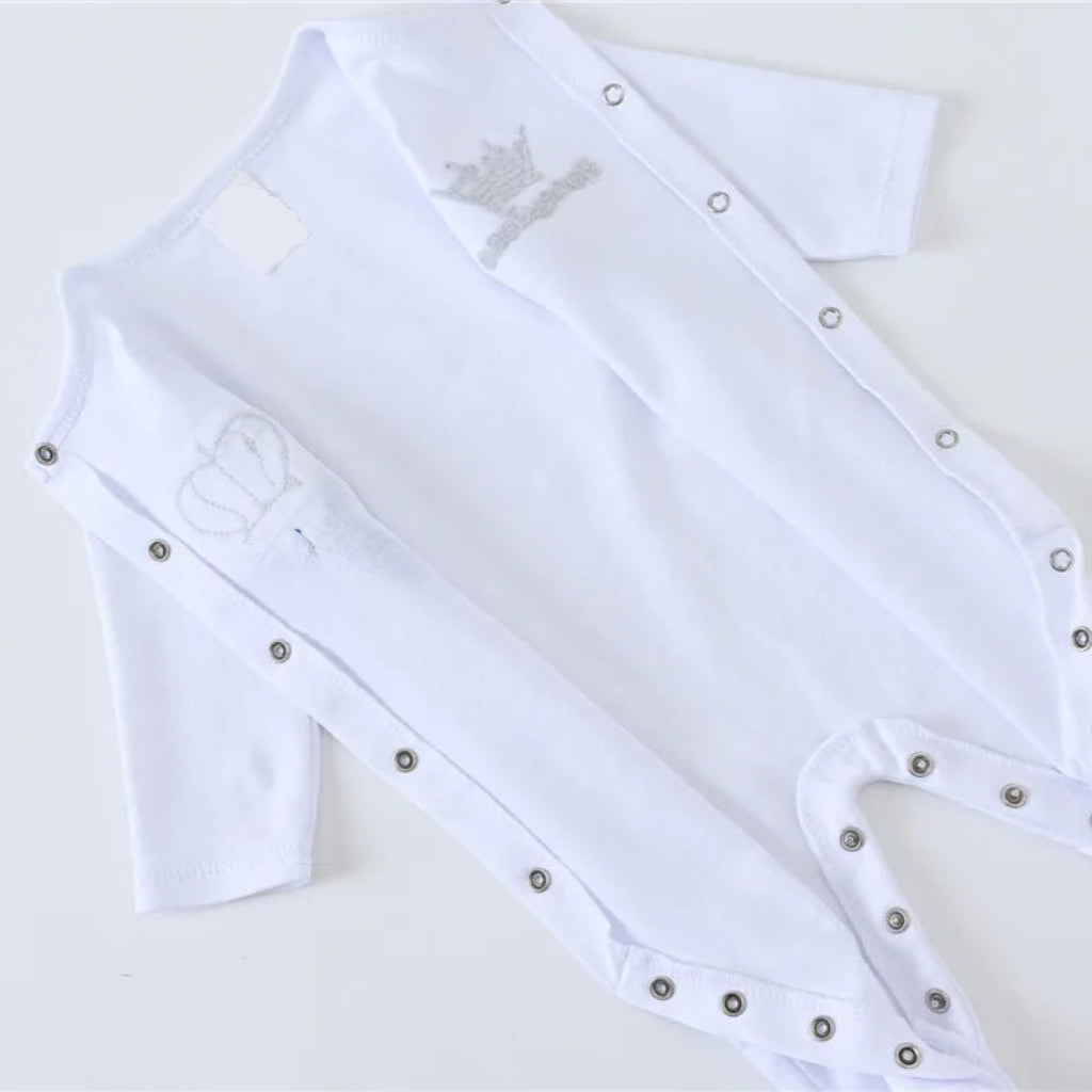 Give your little one a touch of royalty with this adorable 3-piece set. Made from 100% soft cotton, it includes a cozy romper, matching hat, and mittens—each detailed with crown embroidery and a cute satin bow. Perfect for both baby boys and girls, this set makes a wonderful gift for newborns.