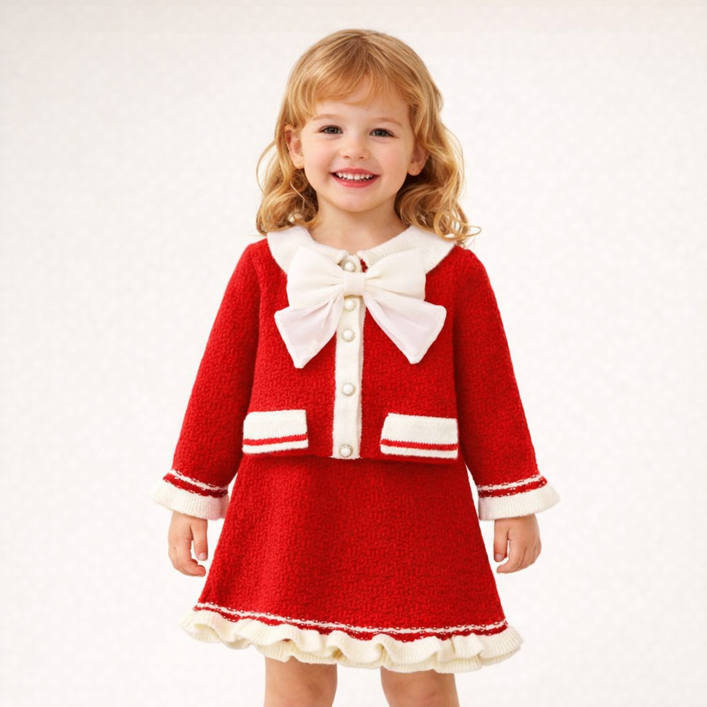 This elegant winter coat-dress set brings warmth, charm, and seasonal style together. Made from a soft acrylic fiber blend, it includes a plush, velvety coat with decorative trim and a large bow accent for a classic holiday look. The thick fabric keeps children warm during colder days, while the smooth inner lining ensures comfort without irritation.